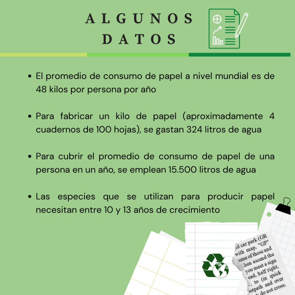 Como se observa, cada vez que utilizamos papel estamos consumiendo otros recursos naturales, principalmente, agua. Estos recursos son escasos y vitales para nuestro planeta.